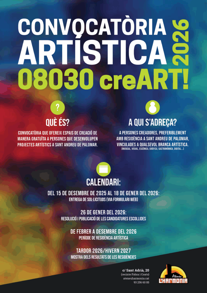 A l’Ateneu, obrim una nova convocatòria 08030 creART! per a residències artístiques. S’ofereixen espais de creació de manera gratuïta a persones que desenvolupen projectes artístics a Sant Andreu de Palomar.